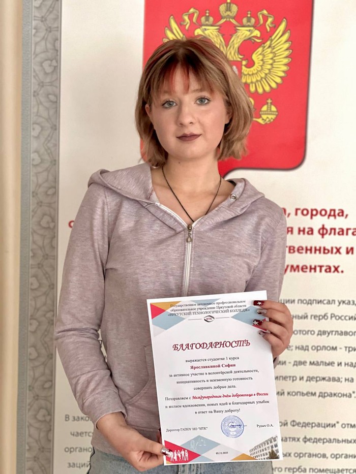 В рамках празднования Международного дня добровольца в России студентке Иркутского технологического колледжа объявлена благодарность за значительный вклад в добровольческие инициативы - Софии Ярославкиной.