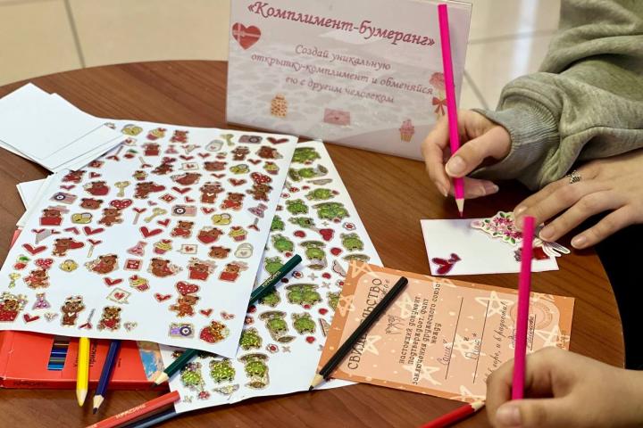 Зона открыток-комплиментов — здесь каждый мог создать персональную открытку с тёплым словом и вручить её тому, кому захочется сделать приятное.