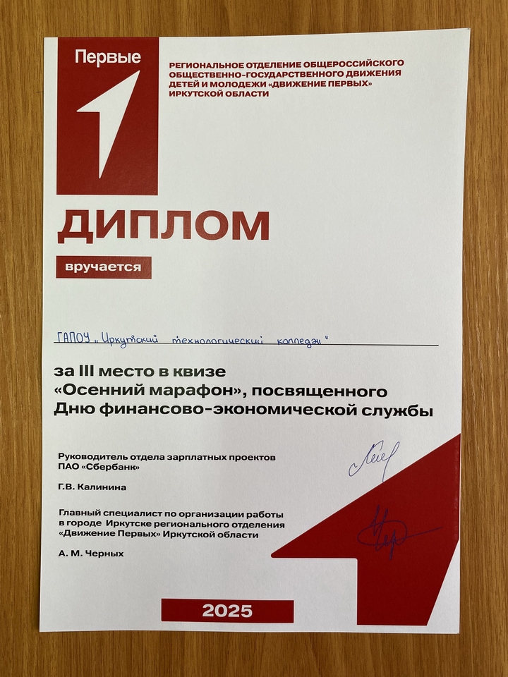 24 октября 2025 года в ЧПОУ «Иркутский техникум экономики и права» состоялся увлекательный квиз «Осенний марафон», организованный Местным отделением Общероссийского общественно-государственного движения детей и молодежи «Движение первых» города Иркутска совместно с ПАО «Сбербанк».