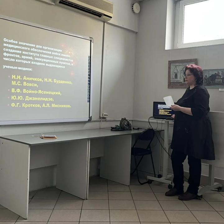 Ольга Анатольевна рассказала о методах лечения раненых бойцов и памяти таких выдающихся медиков, как В.Ф. Войно-Ясенецкого, А.И. Соркиной, В. И. Высоцкой, З. Г. Франк-Камецкого, В. Г. Щипачева, которые практиковали в иркутских госпиталях в годы войны и внесли значительный вклад в победу и в саму медицину